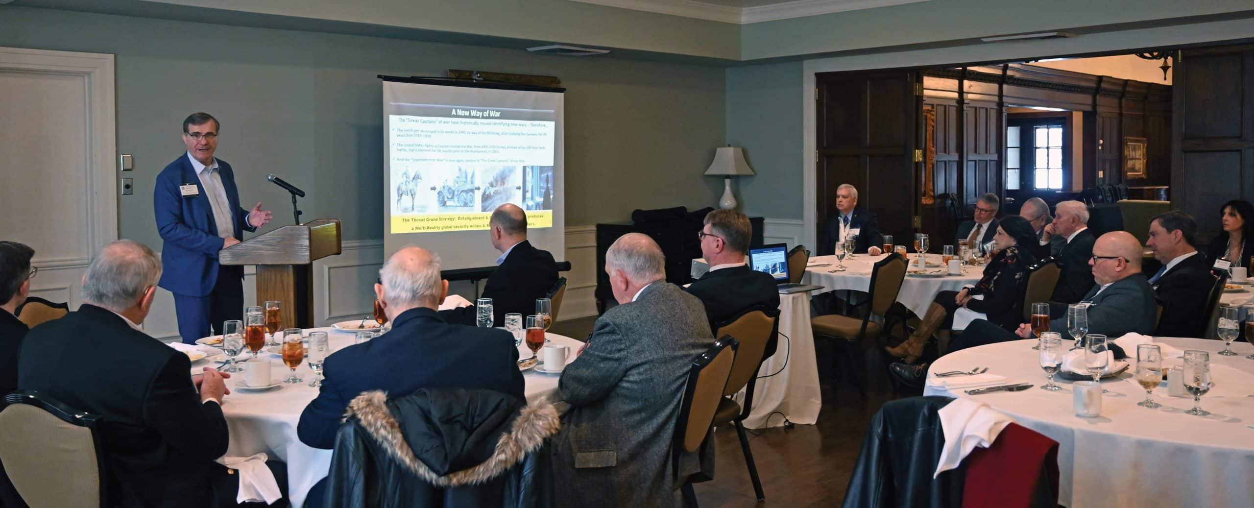 Simons Center Director Bob Ulin welcomed the ARNSF members, some of whom also introduced their guests, and then introduced retired Col. Steve Banach who provided the forum with a presentation on virtual warfare.