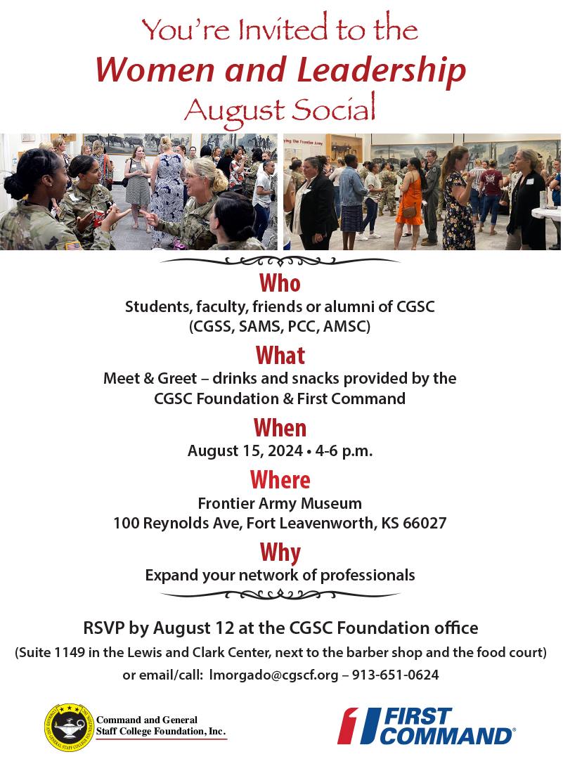 The AY2025 Women and Leadership program will kick-off with a social from 4-6 p.m. at the Frontier Army Museum (100 Reynold Ave. Fort Leavenworth, KS) on Aug. 15.
