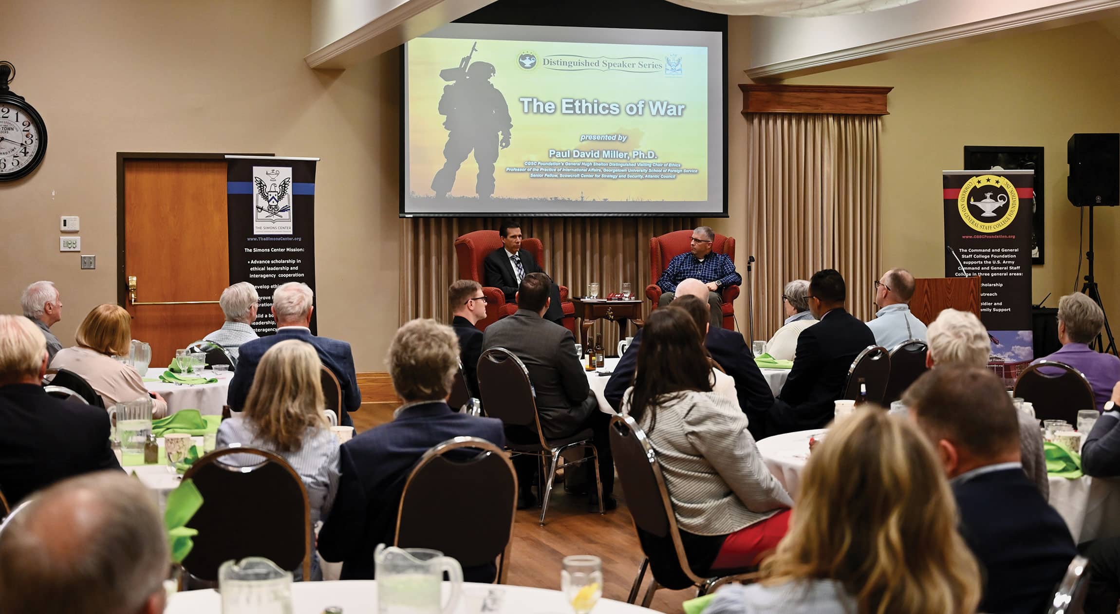 The CGSC Foundation and its Simons Center hosted the first lecture of the 2025 Distinguished Speaker Series at the Riverfront Community Center in downtown Leavenworth, Kansas on April 2, 2025. In this installment of the series, Dr. Paul D. Miller, CGSC Foundation’s General Hugh Shelton Distinguished Visiting Chair of Ethics, and Chaplain (Lt. Col.) Derek M. Pottinger, instructor of ethics and world religions at CGSC, conducted a presentation and discussion of Miller’s latest book, Ethics of War: A Short Companion.