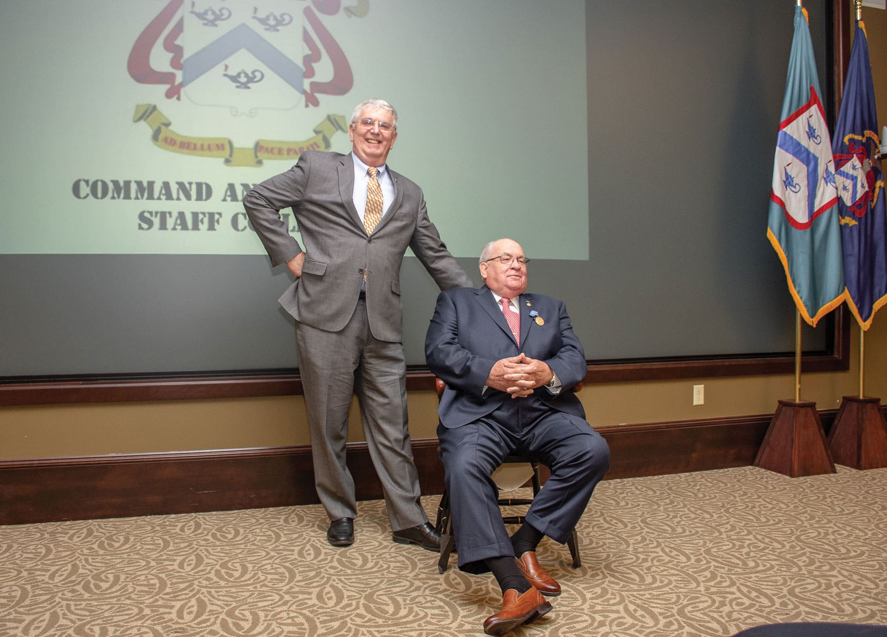 In recognition of his selection as CGSC Professor Emeritus, the Foundation presented Willbanks with a CGSC College chair, but not without having a little fun with him initially. The first chair Tystad unveiled was a child-sized rocking chair version which drew a few laughs, even from Willbanks. After a good chuckle, Tystad presented him with the actual chair, a gift the Foundation presents to every selected emeritus professor.
