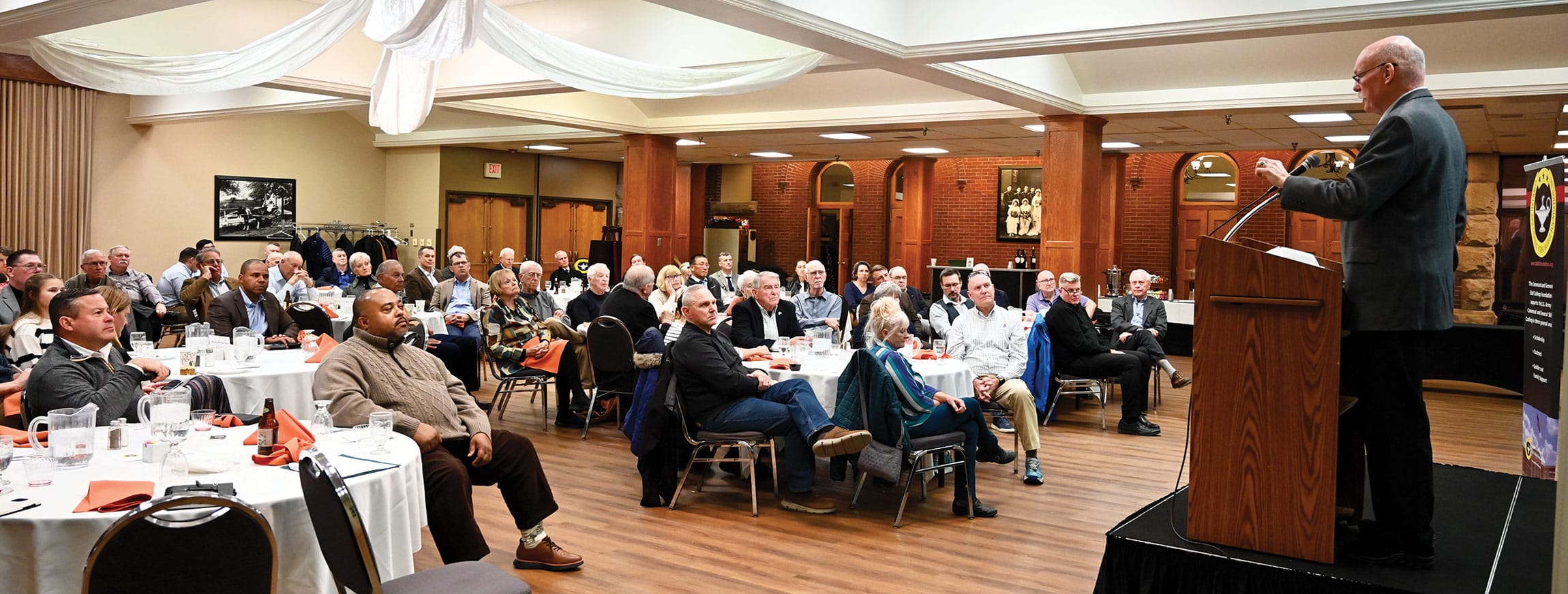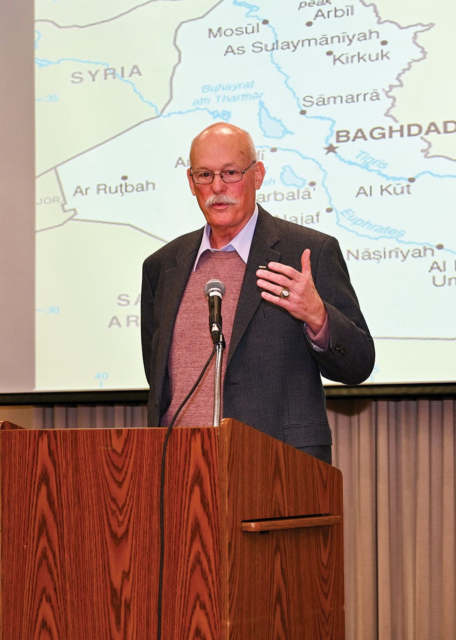 The CGSC Foundation and its Simons Center hosted the fourth lecture of the 2024 Distinguished Speaker Series at the Riverfront Community Center in downtown Leavenworth, Kansas on Nov. 20, 2024. In this installment of the series, retired Army Colonel Kevin Benson, Ph.D., provided a presentation entitled “Reflections on the Opening of the War in Iraq.”