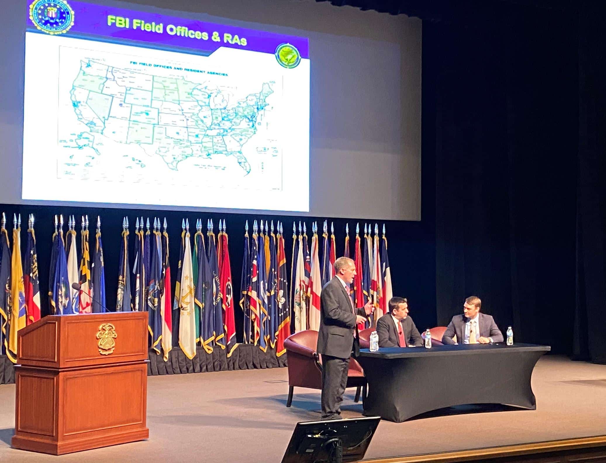 The seventh presentation of the InterAgency Brown-Bag Lecture Series for academic year 2022 was conducted on April 20, in the Eisenhower Auditorium of the Lewis and Clark Center. This lecture featured three members of the Federal Bureau of Investigation’s Heart of America Joint Terrorism Task Force. – FBI Supervisory Special Agent Dana Kreeger, who previously presented an InterAgency Brown-Bag Lecture in February 2020, was joined by FBI Special Agent Andrew Brown and a Kansas City, Kansas Police Department Detective Vincent Kingston.
