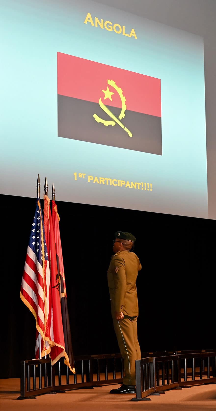 A highlight of this year’s ceremony was the presence of the country of Angola. This is the first year that Angola has sent an officer to the course. Angolan Lt. Col. Arao Daniel posted his nation’s colors during the ceremony.