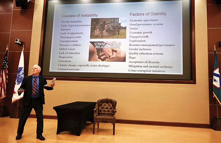 CGSC Foundation President/CEO Rod Cox provided welcoming remarks and introduced Dr. Mark Sorensen, the CGSC Distinguished Chair for Development Studies. Sorensen led a discussion on how the U.S. Agency for International Development (USAID) leads America’s development assistance abroad and how USAID coordinates with defense professionals. He began his discussion with a detailed look at USAID’s mission statement and where the agency is currently deployed around the world. After his presentation he conducted a question and answer session with attendees, including answering questions about USAID’s current humanitarian assistance efforts in eastern Europe.