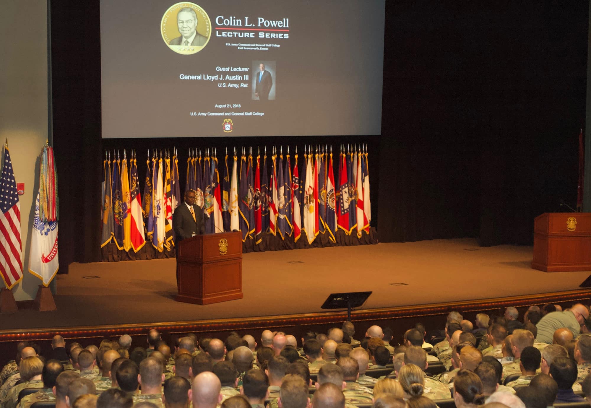 Gen. Lloyd J. Austin III, U.S. Army, Ret., the former commander of U.S. Central Command, presented the annual General Colin L. Powell Lecture for students of the 2019 Command and General Staff Officer’s Course, Aug. 21 at Fort Leavenworth’s Lewis and Clark Center. Austin shared three things with the students — the evolution of the military over the past four decades, what he sees as the military’s focus going forward, and lessons learned over his 40-plus years in service.