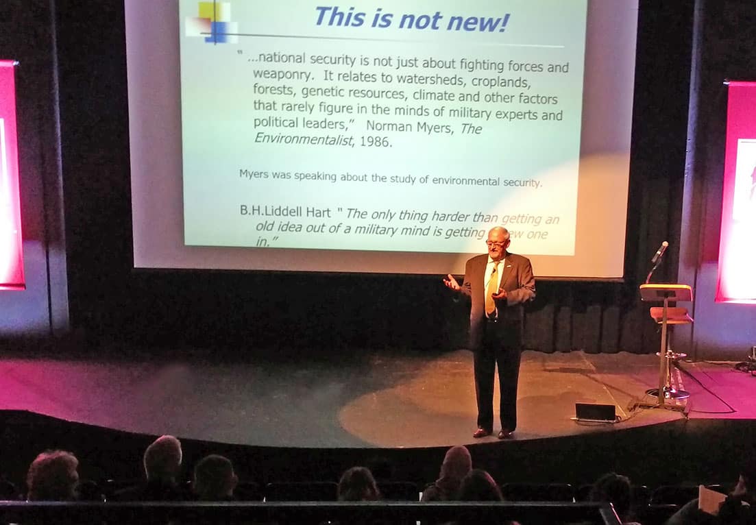 King provided the audience with statistical data on water usage, temperature change, greenhouse gases, and population trends and discussed the implications and challenges to national security and world instability that environmental changes pose.