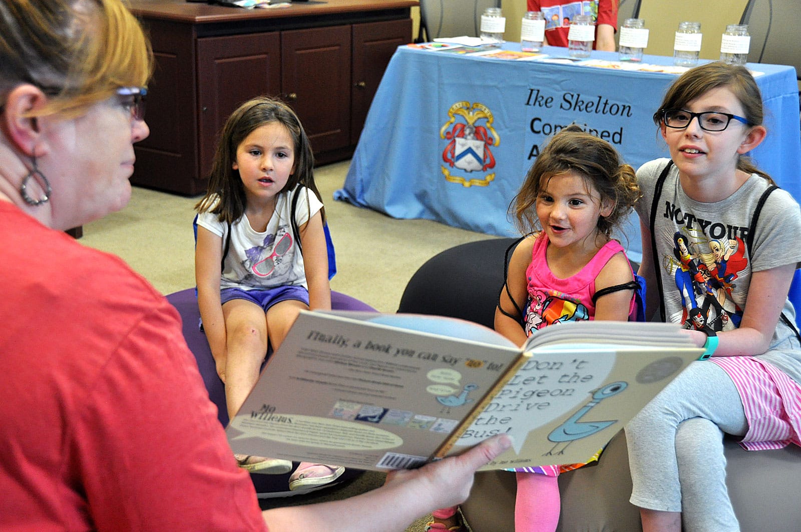In the photo above, Librarian Susan Plotner reads “Don’t Let the Pigeon Drive the Bus!” to 4-year-old Logan Looney, 6-year-old Lahn Looney and 11-year-old Rebekah Tanner at the “Reading by Design” summer reading program kick-off event June 2 at the Combined Arms Research Library.