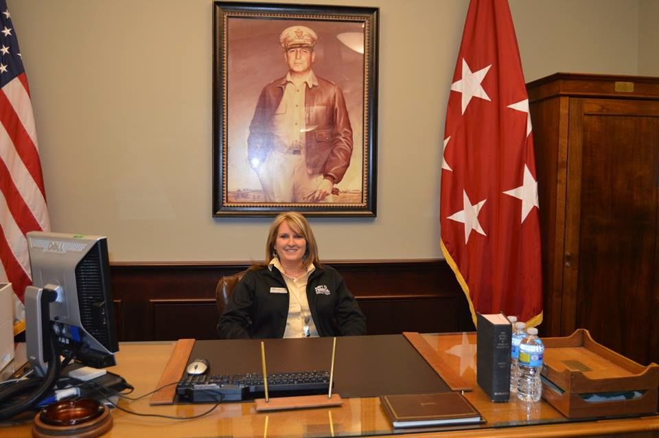 Linda Orton, Leavenworth/Lansing Area Chamber of Commerce treasurer, takes a seat behind the historic MacArthur desk in the MacArthur Room located just off the atrium of the Lewis and Clark Center during a tour of the facility.