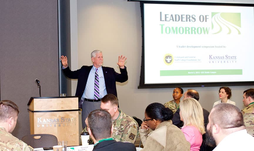 #LeadersofTomorrowKC – The Command and General Staff College Foundation and Kansas State University hosted the Leaders of Tomorrow symposium on Thursday, March 8, at the Kansas State University Olathe campus. The symposium was focused on leader development for mid-career professionals in both the military and the private sector. More than 110 were in attendance including 26 military officer students from the U.S. Army Command and General Staff College (CGSC).