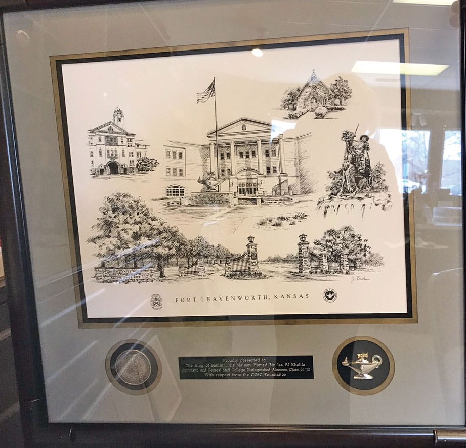 Brig. Gen. Drewfs presented the gift to the king on April 30 at a reception at the King’s palace in the capitol of Bahrain. Drewfs had initially been invited to the gathering since he was a CGSC classmate of the king and was the most appropriate presenter for the gift the Foundation provided to the U.S. Embassy. The gift is a pen and ink drawing of iconic places and images that make Fort Leavenworth the unique community that it is. These prints are available in the Foundation gift shop. The Foundation’s preferred framing provider, DorMail, Inc., framed the print with two special Foundation coins. The plaque recognized the King’s distinction as an honored member of the IHOF.