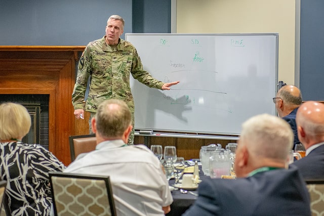 As you can read in our recent articles on this website, on Aug. 21 we hosted retired Gen. Lloyd Austin to address the class as the introduction to the C200 block of instruction on national security strategy. General Austin was the 12th commanding general of U.S. Central Command prior to his retirement. Austin’s lecture was part of the Foundation’s Colin Powell Lecture Series which is sponsored by an enduring gift from TriWest Healthcare Alliance. A week later on Aug. 28, we hosted retired Gen. Ann Dunwoody, the first woman promoted to four-star general in the U.S. military, to be the initial speaker for the L100 Leadership block of instruction. As part of her visit, we supported an AUSA Henry Leavenworth Chapter breakfast, a book signing at the world famous CGSC Book Store, an influencers lunch at Country Club Bank in Kansas City, and an evening event with the Kansas City Junior League. We had an amazing response everywhere she went. General Dunwoody’s support to the ethics and leadership curriculum was made possible by an enduring grant from the Perot Foundation. Our final major event was again a week later on Sept. 6 when we supported the School of Command Preparation (SCP) Executive Leader Summit with 24 mid and senior level executives from Leavenworth and Kansas City. CGSC Deputy Commandant Brig. Gen. Scott L. Efflandt gave the keynote address on leader development and the SCP instructors hosted round table discussions with the executives in a mutual learning environment discussing best practices in senior leader development and continuing education. All participants felt the discussions were very beneficial to their own particular leader development challenges. Support to the Executive Leader Summit came from LWM III Consulting, a True Growth company. We also supported the annual Commandant’s Reception for the new Class of 2019 through a grant from Webster University.