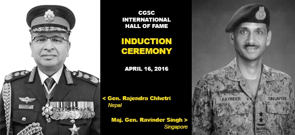 Gen. Rajendra Chhetri of Nepal and Maj. Gen. Ravinder Singh of Singapore were inducted into the International Hall of Fame during a ceremony in the Eisenhower Auditorium at the Lewis and Clark Center. Lt. Gen. Robert Brown, commanding general of the Combined Arms Center and Fort Leavenworth and CGSC commandant, presided over the ceremony.