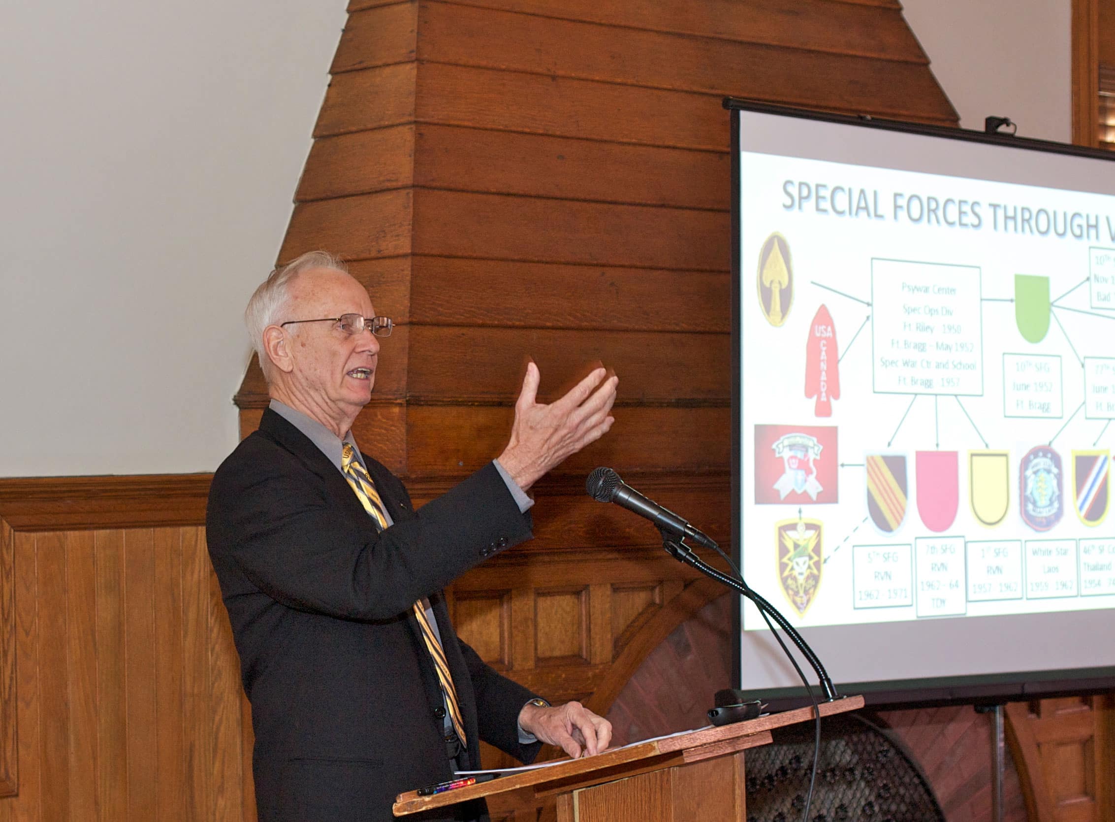 Several Vietnam-era Special Forces veterans were in the audience along other Vietnam veterans, friends and others, some new and some regular attendees to this lecture series. Kiper demonstrated an in-depth understanding of the Special Forces presence during Vietnam. He spoke for a full hour on the background history and details of SF units and missions in Vietnam. Of particular note was the reaction that the Vietnam veterans in the audience had when Kiper showed a photo of Martha “Maggie” Raye, an actress and singer, who many of them knew as a champion of Soldiers in Vietnam and as an honorary Green Beret nicknamed “Colonel Maggie.”