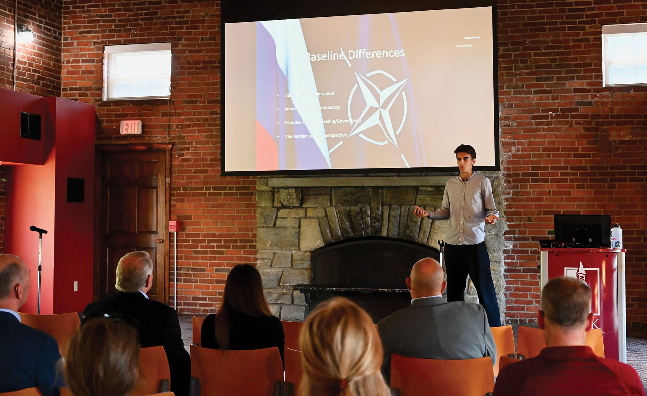 The Simons Center’s most recent collegiate intern, Tom Kuehnel, an undergraduate student from Hamburg, Germany studying at Park University, conducted a final briefing on his project to his advisors, Park University representatives and Simons Center leadership in the McCoy Meetin’ House at Park University on June 14, 2024.