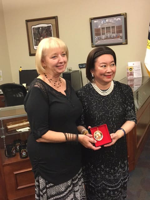 During his visit to CGSC Gen. Surapong and his wife also visited the CGSC Foundation office and gift shop where they purchased some CGSC mementos. Foundation CEO Doug Tystad presented the general with a Foundation coin and Foundation Director of Operations Ann Soby presented his wife with a holiday ornament. Tystad and the U.S. Defense Attaché who was accompanying the general also had the opportunity to speak about future opportunities with the Foundation and the Thai staff college.