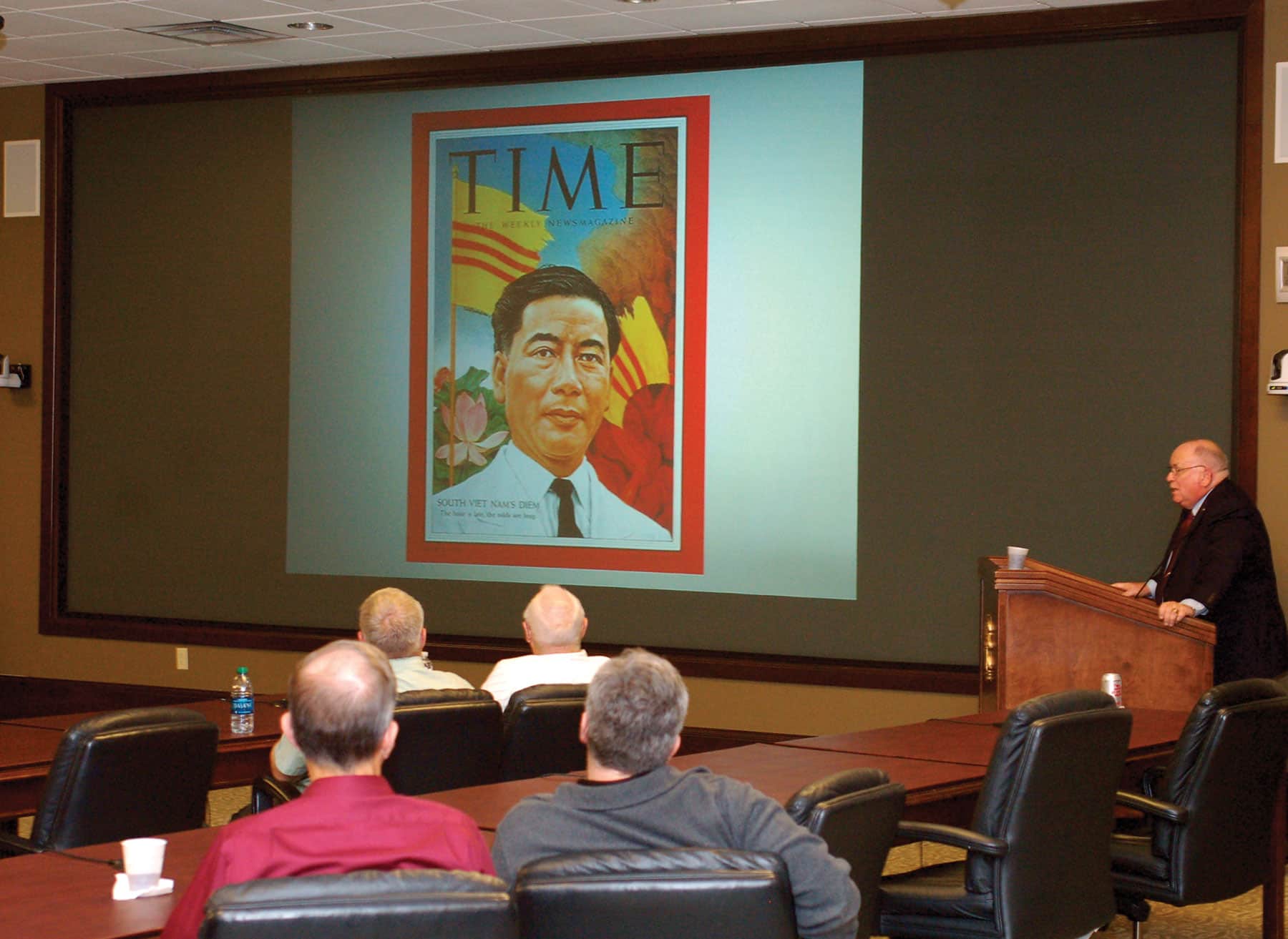 The second lecture in the Vietnam War Commemoration Lecture Series was conducted Oct. 5 at 6 p.m. in the Arnold Conference Room of the Lewis and Clark Center on Fort Leavenworth. This second lecture in the series was entitled “The Diem Years and the Early Advisory Effort, 1956-1963.” Dr. James H. Willbanks, CGSC’s General of the Army George C. Marshall Chair of Military History, led a discussion on early U.S. involvement in Vietnam from the period of U.S. support to the French, to U.S.-led advisory period from 1956-1963. A reception sponsored by the CGSC Foundation began at 5:30 p.m.