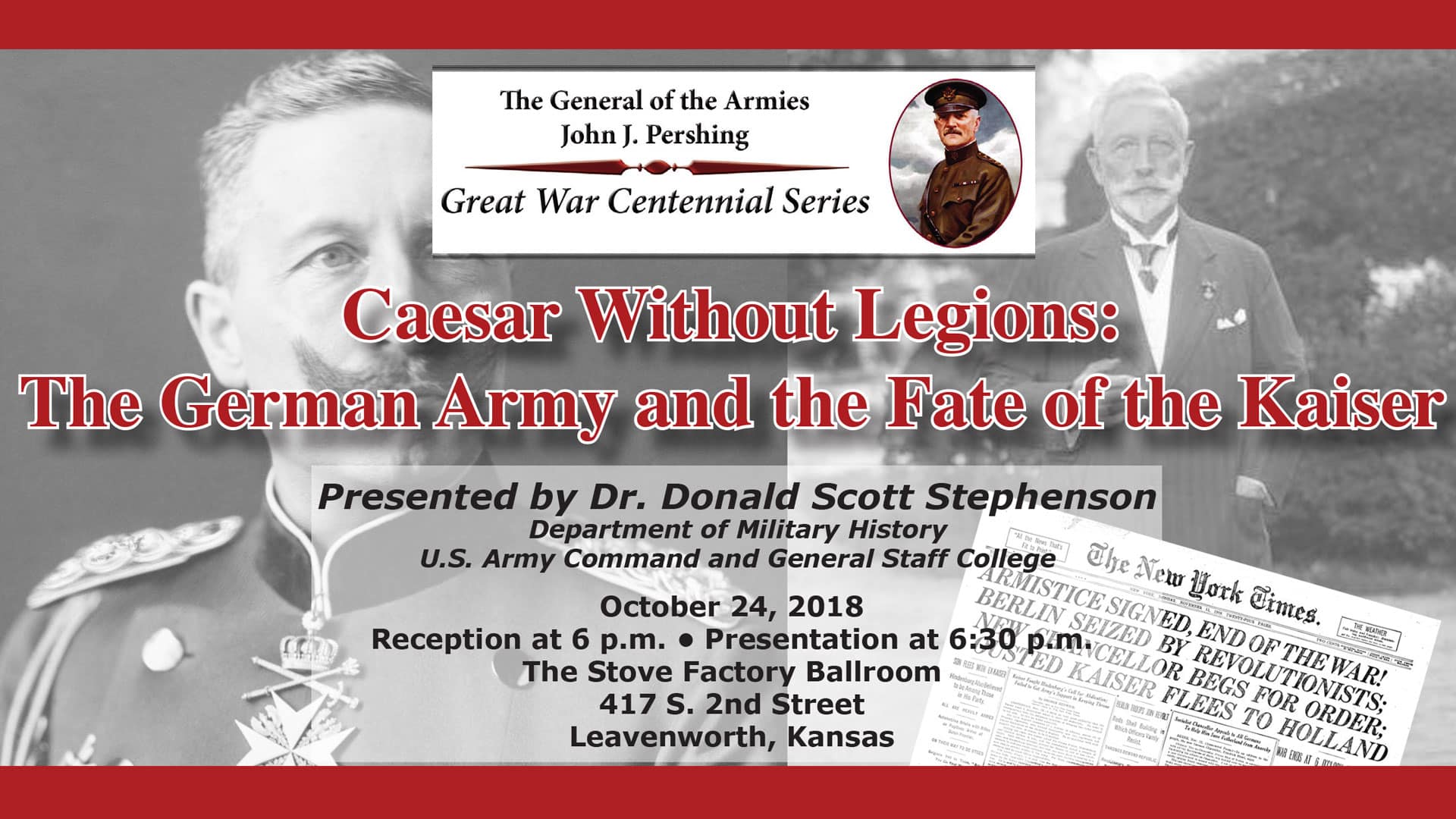 The Department of Military History of the U.S. Army Command and General Staff College and the CGSC Foundation at Fort Leavenworth invite the public to attend the 17th in a series of lectures intended to educate the public about World War I during its 100-year commemoration. – Dr. Donald Scott Stephenson will present “Caesar Without Legions: The German Army and the Fate of the Kaiser,” at the Stove Factory Ballroom in downtown Leavenworth, Kansas (417 S. 2nd Street), Oct. 24, at 6:30 p.m. Attendees are also invited to the reception that begins at 6 p.m.